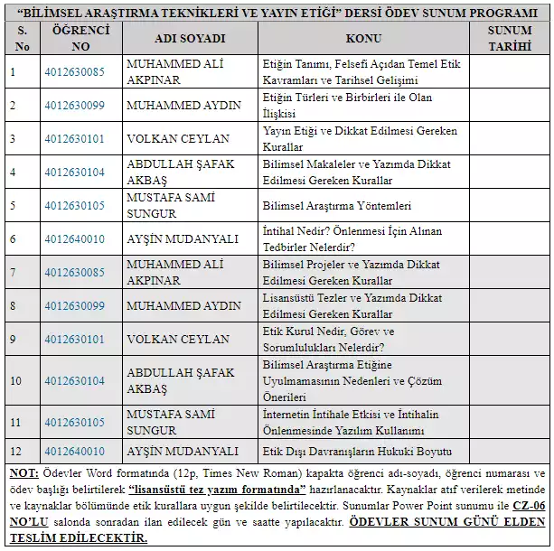 Bilimsel Araştırma Teknikleri ve Yayın Etiği Dersi Ödev Lİstesi