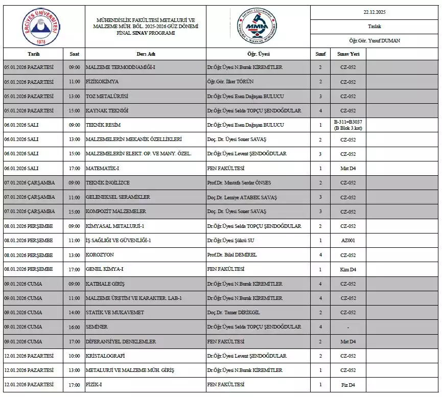 Final Sınav Programı Taslağı